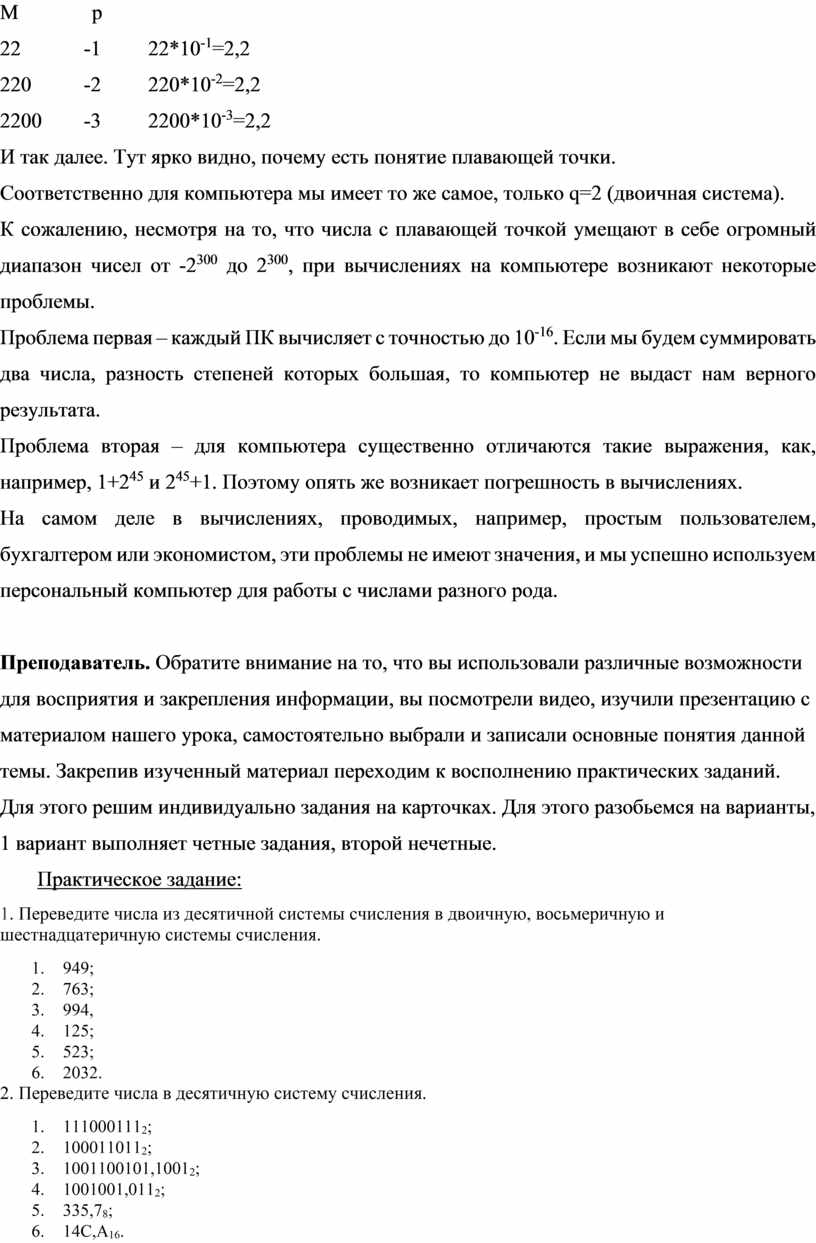 Преподаватель. Обратите внимание на то, что вы использовали различные возможности для восприятия и закрепления информации, вы посмотрели видео, изучили презентацию с материалом нашего урока, самостоятельно выбрали и записали основные понятия данной темы. Закрепив изученный материал переходим к восполнению практических заданий. Для этого решим индивидуально задания на карточках. Для этого разобьемся на варианты, 1 вариант выполняет четные задания, второй нечетные.