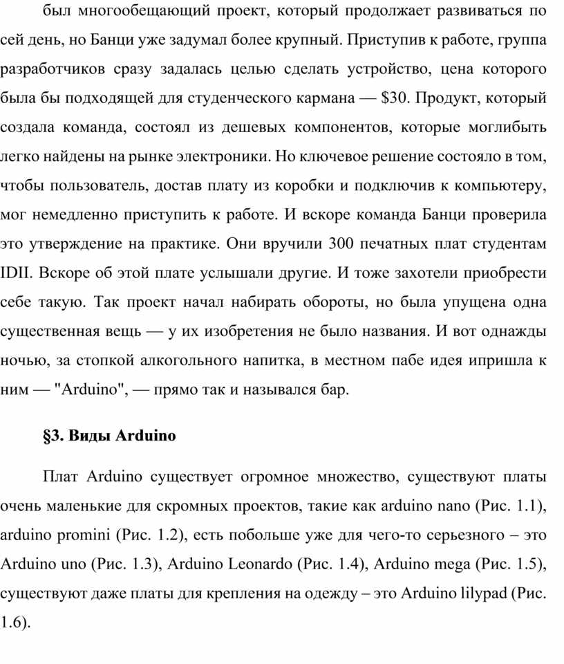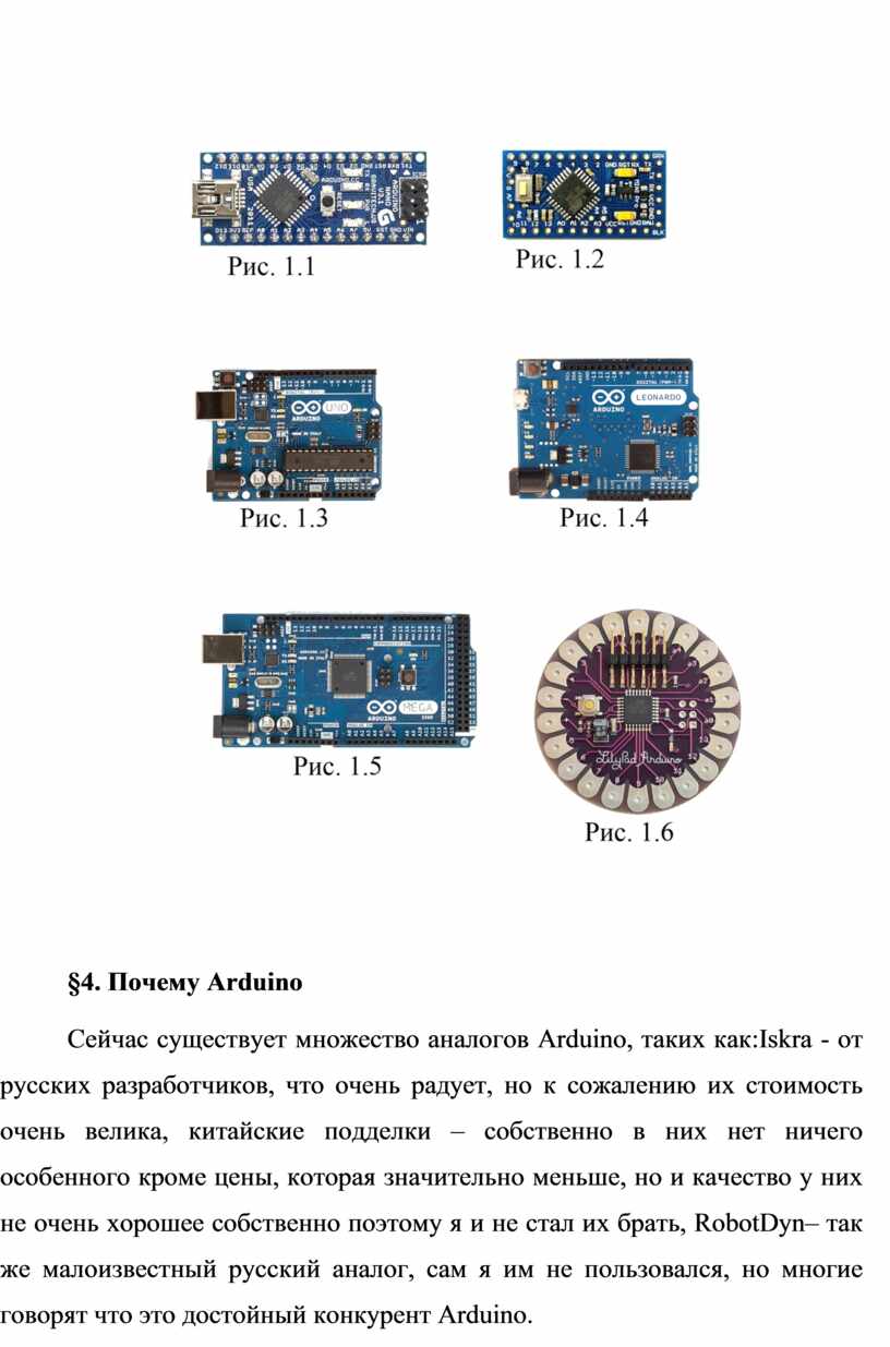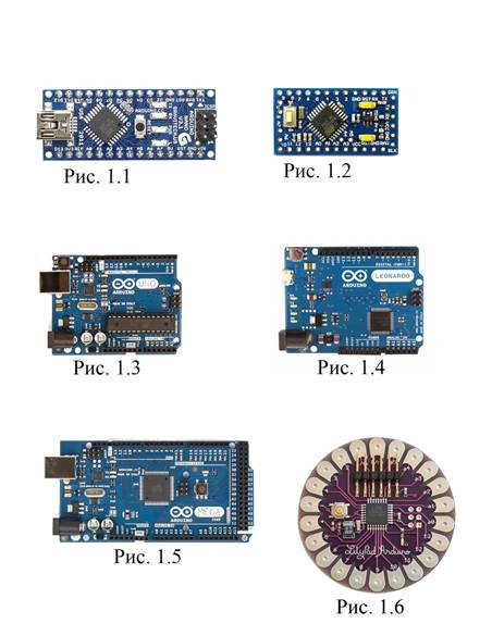 Плат Arduino существует огромное множество, существуют платы очень маленькие для скромных проектов, такие как arduino nano (Рис. 1.1), arduino promini (Рис. 1.2), есть побольше уже для чего-то серьезного – это Аrduino uno (Рис. 1.3), Аrduino Leonardo (Рис. 1.4), Аrduino mega (Рис. 1.5), существуют даже платы для крепления на одежду – это Аrduino lilypad (Рис. 1.6).