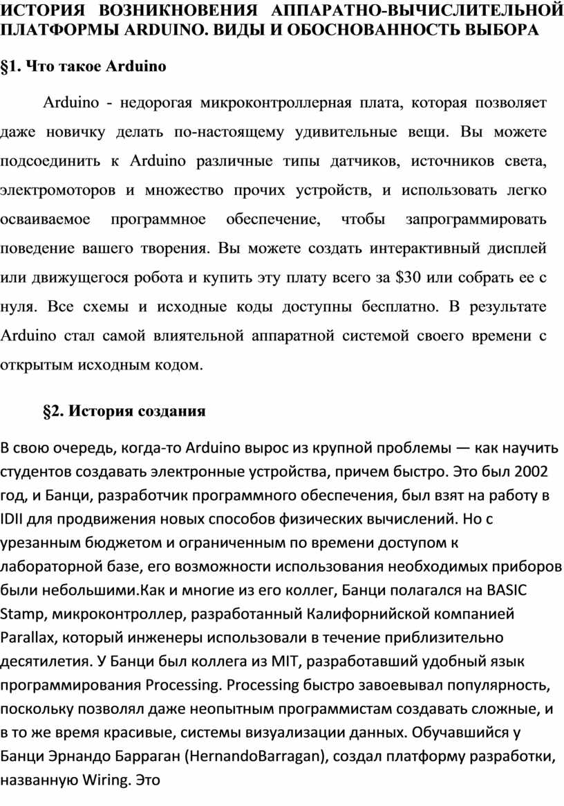 В свою очередь, когда-то Arduino вырос из крупной проблемы — как научить студентов создавать электронные устройства, причем быстро. Это был 2002 год, и Банци, разработчик программного обеспечения, был взят на работу в IDII для продвижения новых способов физических вычислений. Но с урезанным бюджетом и ограниченным по времени доступом к лабораторной базе, его возможности использования необходимых приборов были небольшими.Как и многие из его коллег, Банци полагался на BASIC Stamp, микроконтроллер, разработанный Калифорнийской компанией Parallax, который инженеры использовали в течение приблизительно десятилетия. У Банци был коллега из MIT, разработавший удобный язык программирования Processing. Processing быстро завоевывал популярность, поскольку позволял даже неопытным программистам создавать сложные, и в то же время красивые, системы визуализации данных. Обучавшийся у Банци Эрнандо Барраган (HernandoBarragan), создал платформу разработки, названную Wiring. Это был многообещающий проект, который продолжает развиваться по сей день, но Банци уже задумал более крупный. Приступив к работе, группа разработчиков сразу задалась целью сделать устройство, цена которого была бы подходящей для студенческого кармана — $30. Продукт, который создала команда, состоял из дешевых компонентов, которые моглибыть легко найдены на рынке электроники. Но ключевое решение состояло в том, чтобы пользователь, достав плату из коробки и подключив к компьютеру, мог немедленно приступить к работе. И вскоре команда Банци проверила это утверждение на практике. Они вручили 300 печатных плат студентам IDII. Вскоре об этой плате услышали другие. И тоже захотели приобрести себе такую. Так проект начал набирать обороты, но была упущена одна существенная вещь — у их изобретения не было названия. И вот однажды ночью, за стопкой алкогольного напитка, в местном пабе идея ипришла к ним — "Arduino", — прямо так и назывался бар.