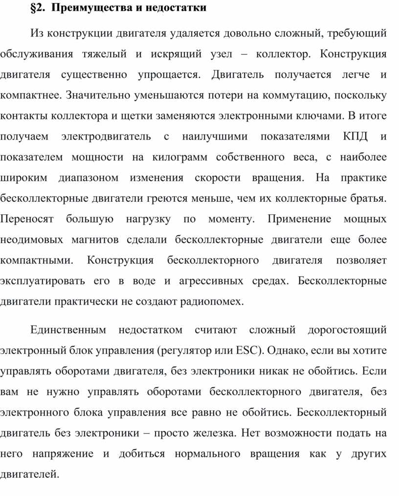 Единственным недостатком считают сложный дорогостоящий электронный блок управления (регулятор или ESC). Однако, если вы хотите управлять оборотами двигателя, без электроники никак не обойтись. Если вам не нужно управлять оборотами бесколлекторного двигателя, без электронного блока управления все равно не обойтись. Бесколлекторный двигатель без электроники – просто железка. Нет возможности подать на него напряжение и добиться нормального вращения как у других двигателей.
