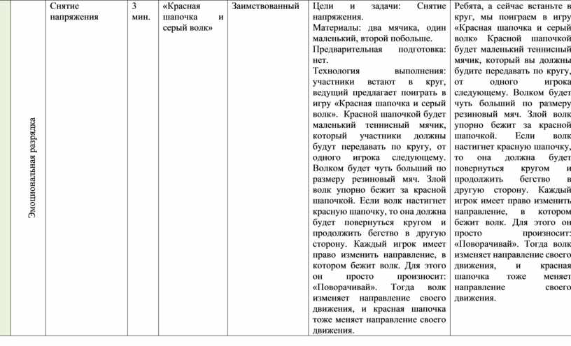 Цели и задачи: Снятие напряжения. Материалы: два мячика, один маленький, второй побольше. Предварительная подготовка: нет. Технология выполнения: участники встают в круг, ведущий предлагает поиграть в игру «Красная шапочка и серый волк». Красной шапочкой будет маленький теннисный мячик, который участники должны будут передавать по кругу, от одного игрока следующему. Волком будет чуть больший по размеру резиновый мяч. Злой волк упорно бежит за красной шапочкой. Если волк настигнет красную шапочку, то она должна будет повернуться кругом и продолжить бегство в другую сторону. Каждый игрок имеет право изменить направление, в котором бежит волк. Для этого он просто произносит: «Поворачивай». Тогда волк изменяет направление своего движения, и красная шапочка тоже меняет направление своего движения. |