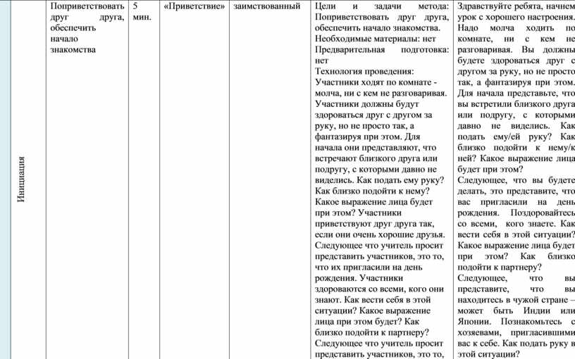 Цели и задачи метода: Поприветствовать друг друга, обеспечить начало знакомства. Необходимые материалы: нет Предварительная подготовка: нет Технология проведения: Участники ходят по комнате - молча, ни с кем не разговаривая. Участники должны будут здороваться друг с другом за руку, но не просто так, а фантазируя при этом. Для начала они представляют, что встречают близкого друга или подругу, с которыми давно не виделись. Как подать ему руку? Как близко подойти к нему? Какое выражение лица будет при этом? Участники приветствуют друг друга так, если они очень хорошие друзья. Следующее что учитель просит представить участников, это то, что их пригласили на день рождения. Участники здороваются со всеми, кого они знают. Как вести себя в этой ситуации? Какое выражение лица при этом будет? Как близко подойти к партнеру? Следующее что учитель просит представить участников, это то, что они находятся в чужой стране – может быть Индии или Японии. Они знакомятся с хозяевами, пригласившими их к себе. Как подать руку в этой ситуации? Теперь участники представляют, что встретили своего друга или подругу, успешно сдавших важный экзамен. Они приветствуют их и поздравляют с важным событием. Как можно без слов выразить свою радость и одобрение? После чего участники делают последний круг по комнате и приветствуют тех участников, с которыми еще не здоровались и выражают своим рукопожатием радость встречи с ними. |