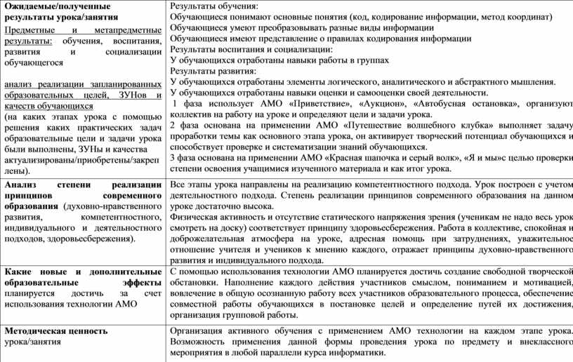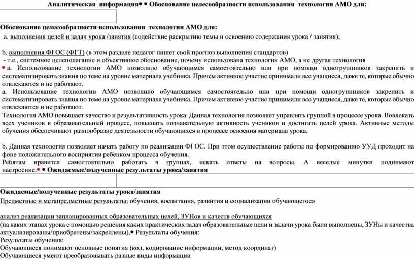 Обоснование целесообразности использования технологии АМО для: а. выполнения целей и задач урока /занятия (содействие раскрытию темы и освоению содержания урока / занятия);