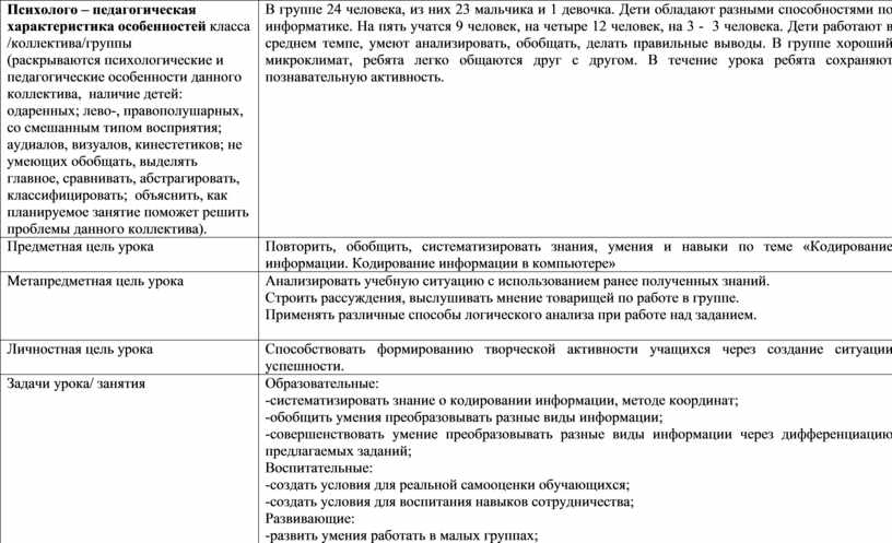 Психолого – педагогическая характеристика особенностей класса /коллектива/группы (раскрываются психологические и педагогические особенности данного коллектива, наличие детей: одаренных; лево-, правополушарных, со смешанным типом восприятия; аудиалов, визуалов, кинестетиков; не умеющих обобщать, выделять главное, сравнивать, абстрагировать, классифицировать; объяснить, как планируемое занятие поможет решить проблемы данного коллектива). |