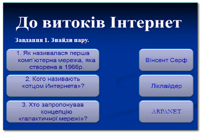 Тут ми пограємо в гру «Знайди пару». Щоб дати відповіді на запитання, ви можете переглянути газету «До витоків Інтернет» або онлайн версію за посиланням: http://ru.calameo.com/read/0024583745b0df1747b71 (Додаток К), яку ми створювали на минулому занятті в програмі Microsoft Office Publisher.