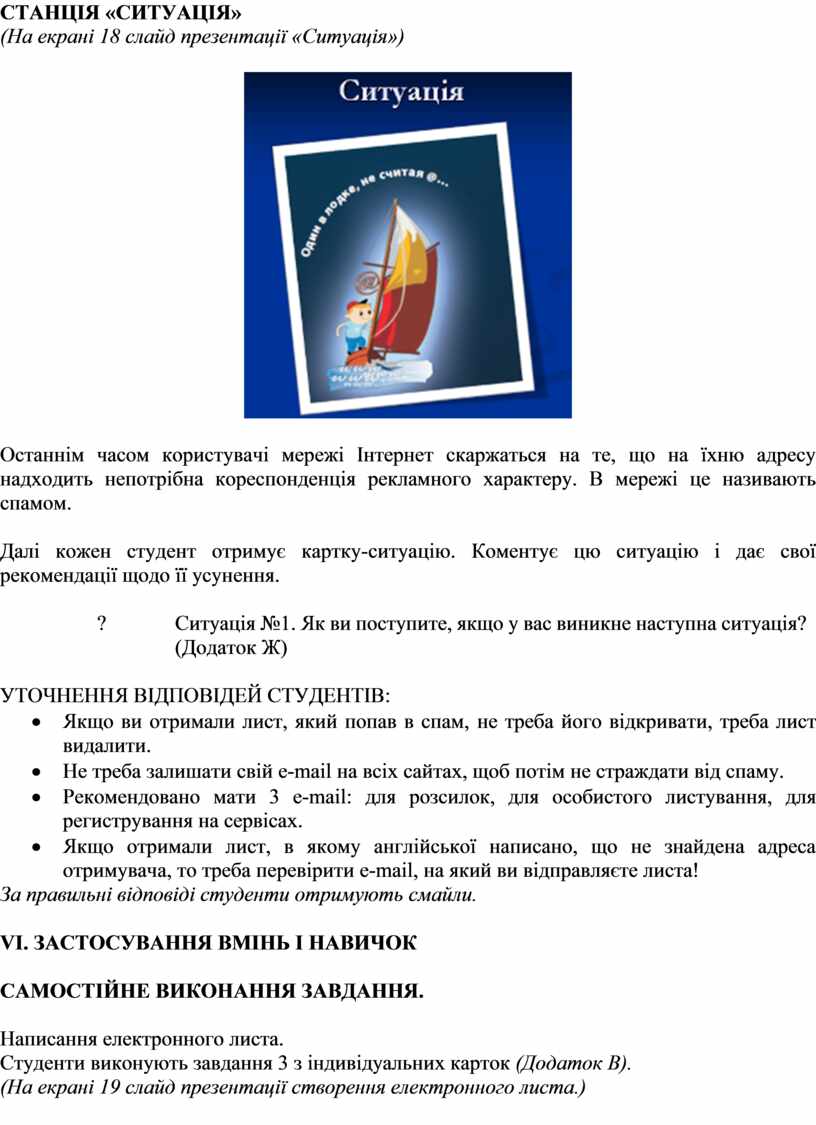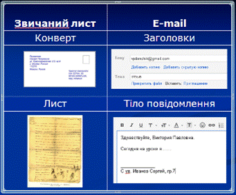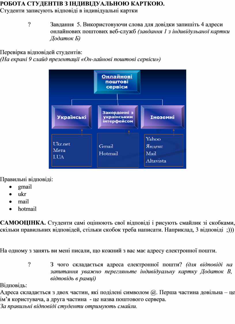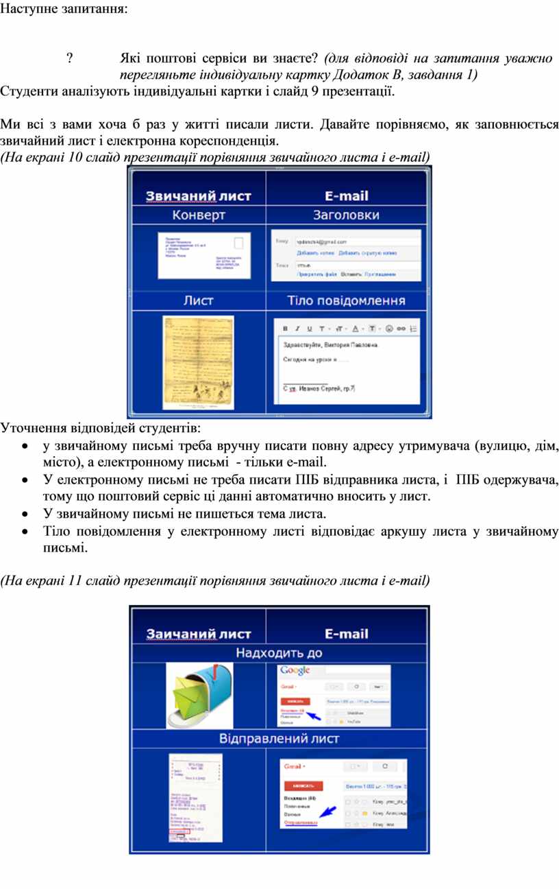 · Загальні відомості про електронну пошту. Індивідуальна робота з картками. Виконання завдань 1 з Додатка В. Самооцінка. Порівняння звичайного листа з електронним листом.