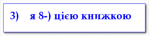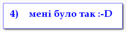 На занятті будьте активні, тому що за кожну правильну відповідь ви будете отримувати такий символ, який «запропонував включити в «сухі» комп’ютерні тексти Кевин Макензи, звернувшися з проханням до “Message Services Group” (MsgGroup) 12 ківтня 1979р.» Що це за символ? |