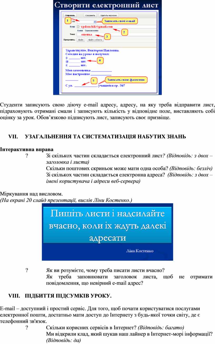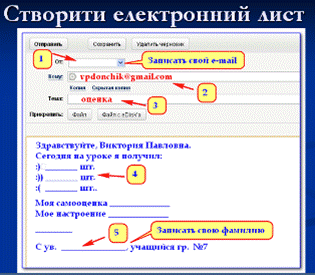 Студенти записують свою діючу e-mail адресу, адресу, на яку треба відправити лист, підраховують отримані смали і записують кількість у відповідне поле, виставляють собі оцінку за урок. Обов’язково підписують лист, записують своє призвіще.