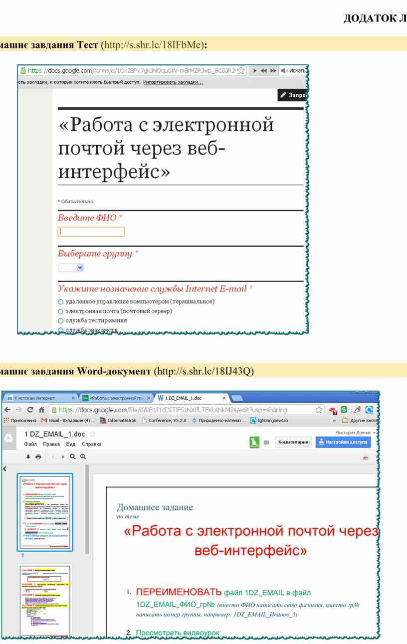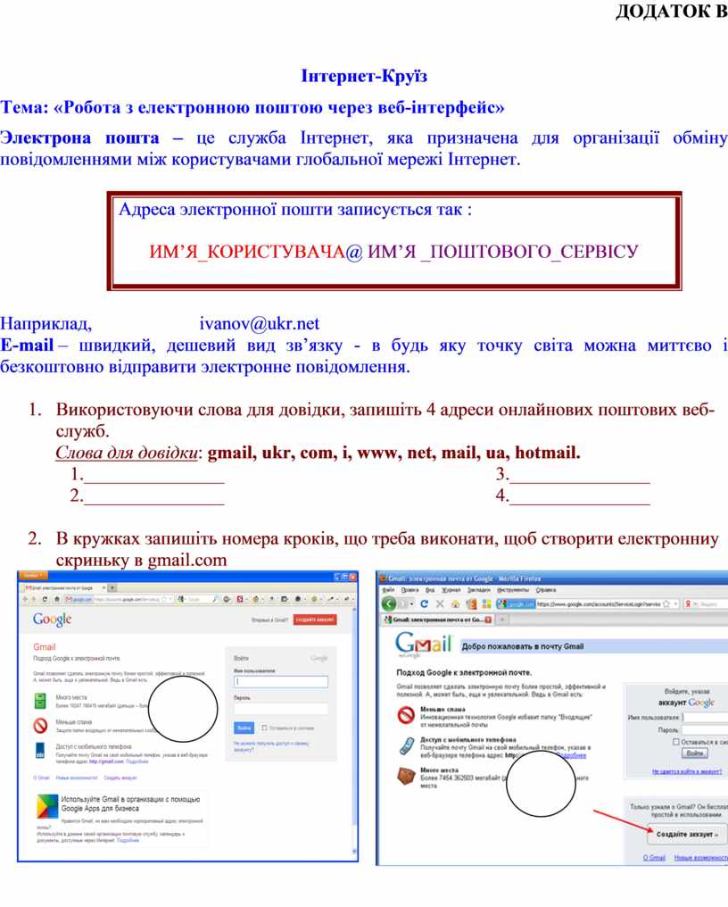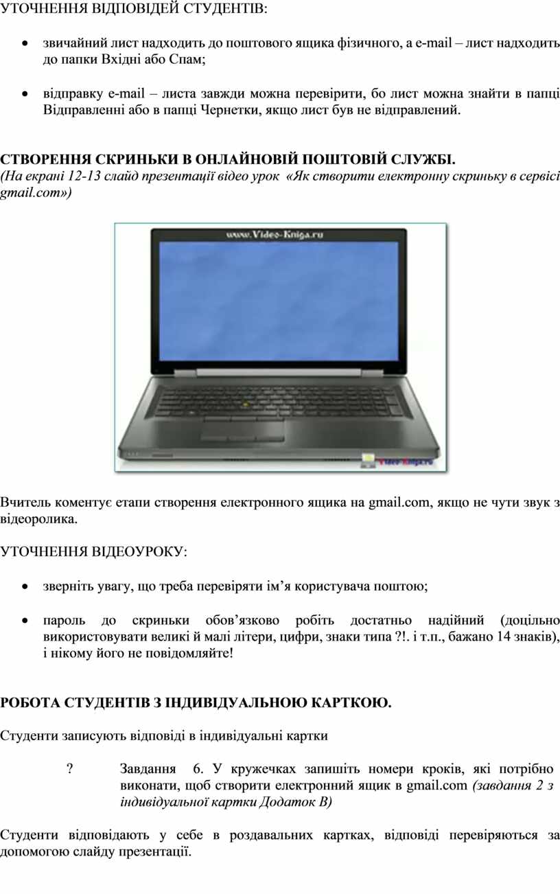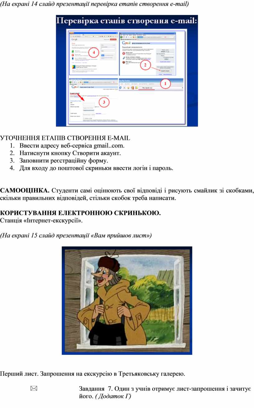 · Створення скриньки в онлайновій поштовій службі (відеоролік). Виконання завдань 2 з Додатка В. Самооцінка.