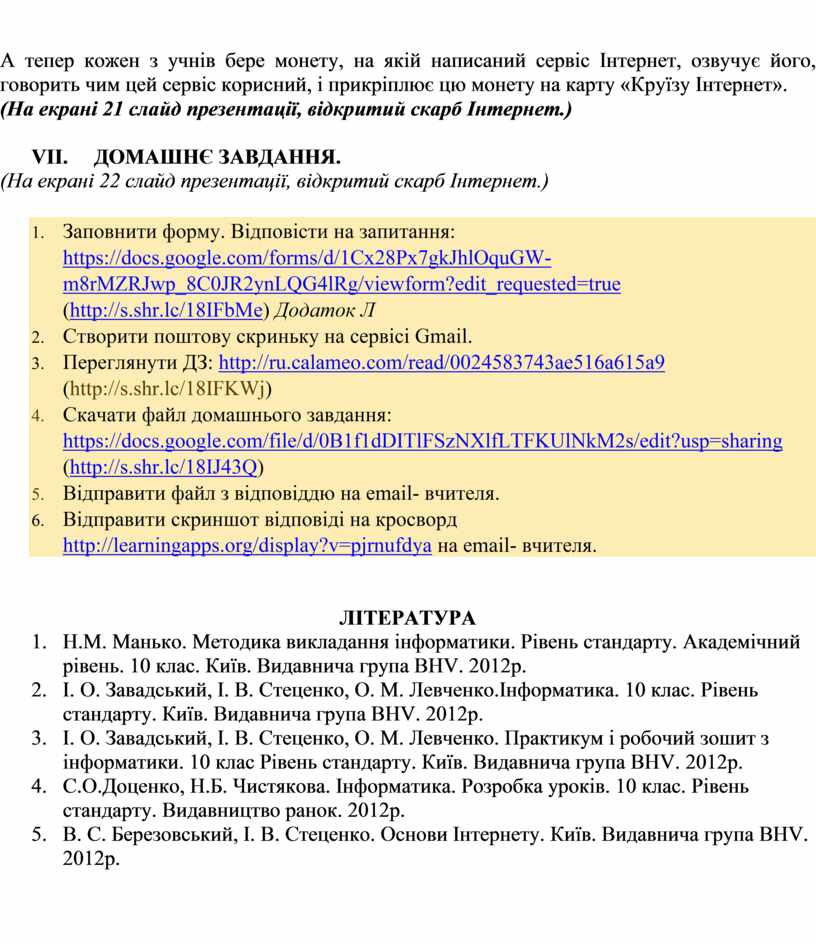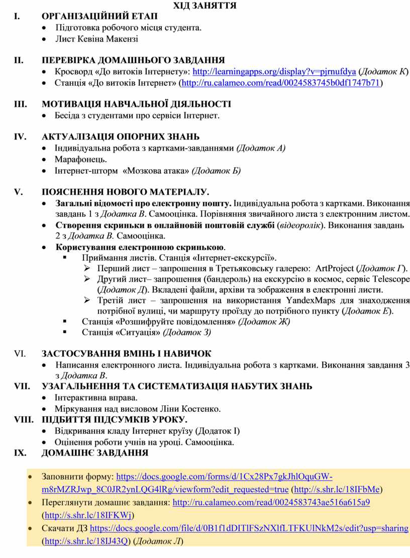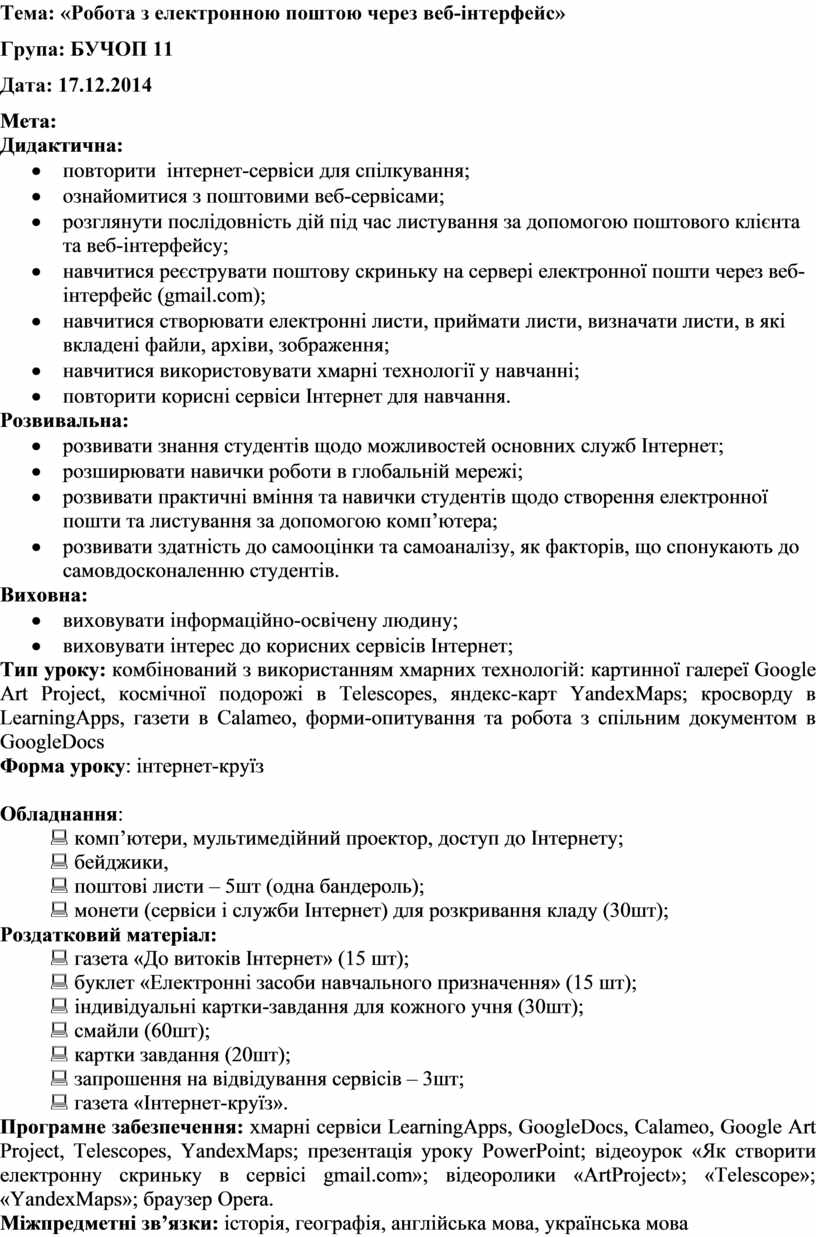 Тип уроку: комбінований з використанням хмарних технологій: картинної галереї Google Art Project, космічної подорожі в Telescopes, яндекс-карт YandexMaps; кросворду в LearningApps, газети в Calameo, форми-опитування та робота з спільним документом в GoogleDocs
