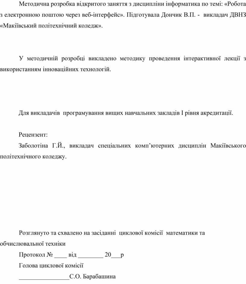 Методична розробка відкритого заняття з дисципліни інформатика по темі: «Робота з електронною поштою через веб-інтерфейс». Підготувала Дончик В.П. - викладач ДВНЗ «Макіївський політехнічний коледж».