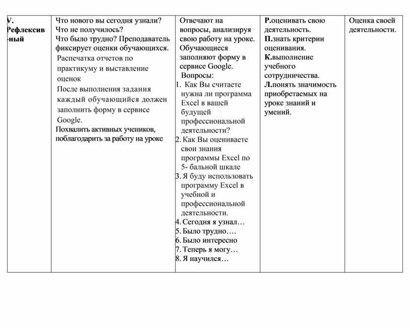 Отвечают на вопросы, анализируя свою работу на уроке. Обучающиеся заполняют форму в сервисе Google. Вопросы: 1. Как Вы считаете нужна ли программа Excel в вашей будущей профессиональной деятельности? 2. Как Вы оцениваете свои знания программы Excel по 5- бальной шкале 3. Я буду использовать программу Excel в учебной и профессиональной деятельности. 4. Сегодня я узнал… 5. Было трудно…. 6. Было интересно 7. Теперь я могу… 8. Я научился…