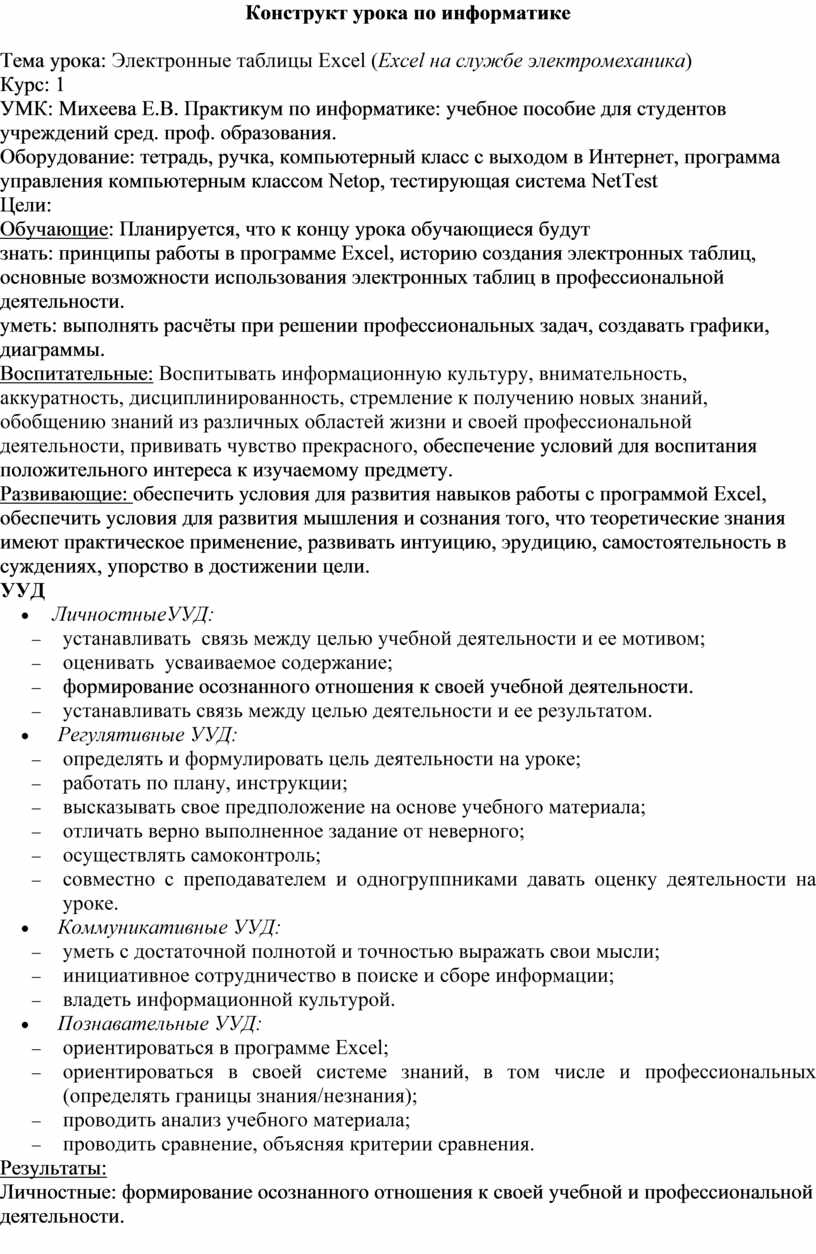 УМК: Михеева Е.В. Практикум по информатике: учебное пособие для студентов учреждений сред. проф. образования.