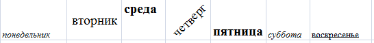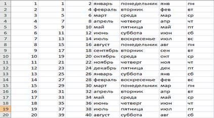 На новом листе введите данные как показано на картинке. Для чисел достаточно ввести два значения, и выделив их, применить функцию автозаполнения. Аналогично автозаполнение можно использовать для месяцев и дней недели, где предварительно можно ввести и выделить только одно значение.
