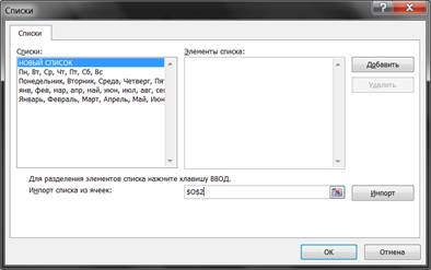 2. Выделить эти ячейки и вызвать окно «Списки».