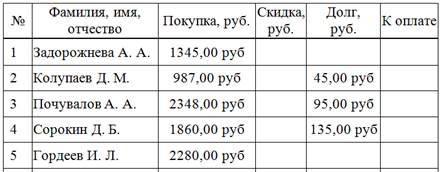 Выполнить расчёты и форматирование. Значение скидки рассчитать, введя произвольный процент скидки. Например, = Покупка*15%.