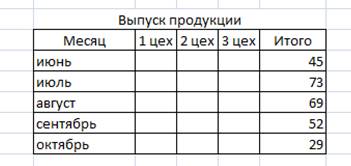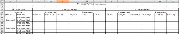 На новом листе, используя автозаполнение, подготовить таблицу для учёта работ в семи отделах по месяцам, по кварталам и по полугодиям.