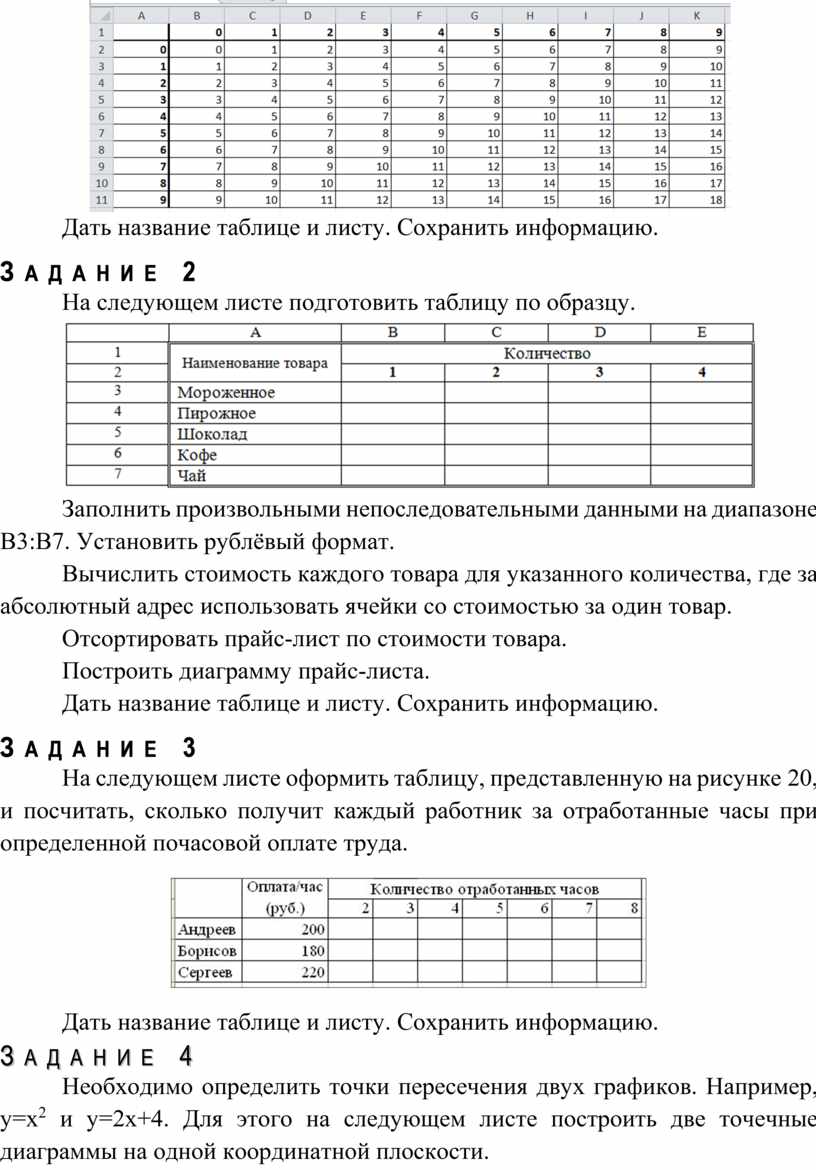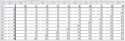 На новом листе составить таблицу сложения (для чётных номеров компьютера) или умножения (для нечётных номеров компьютера) чисел первого десятка, представленную на рисунке 19, пользуясь формулой =$A4+В$3.