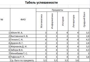На новом листе создать таблицу для определения средней успеваемости студентов, как показано на рисунке.