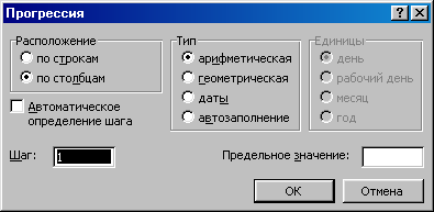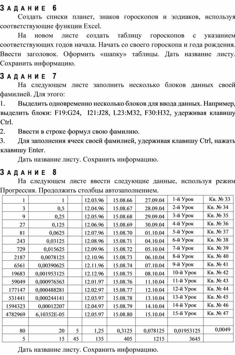 На следующем листе ввести следующие данные, используя режим Прогрессия. Продолжить столбцы автозаполнением.