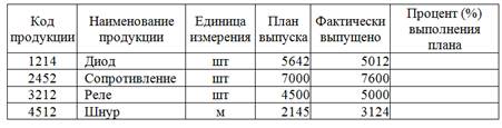Поле «Процент (%) выполнения плана» вычислить по формуле: «Фактически выпущено»/«План выпуска».
