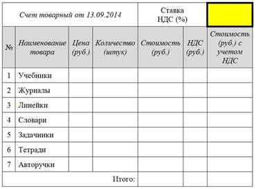 При заполнении значений в столбце с НДС нужно умножать стоимость на значение ставки НДС, указанной в процентах. В качестве значения стоимости в рублях с учетом НДС используется сумма стоимости со значением соответствующей ячейки из столбца НДС.