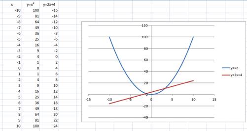 Необходимо определить точки пересечения двух графиков. Например, у=х2 и у=2х+4. Для этого на следующем листе построить две точечные диаграммы на одной координатной плоскости.