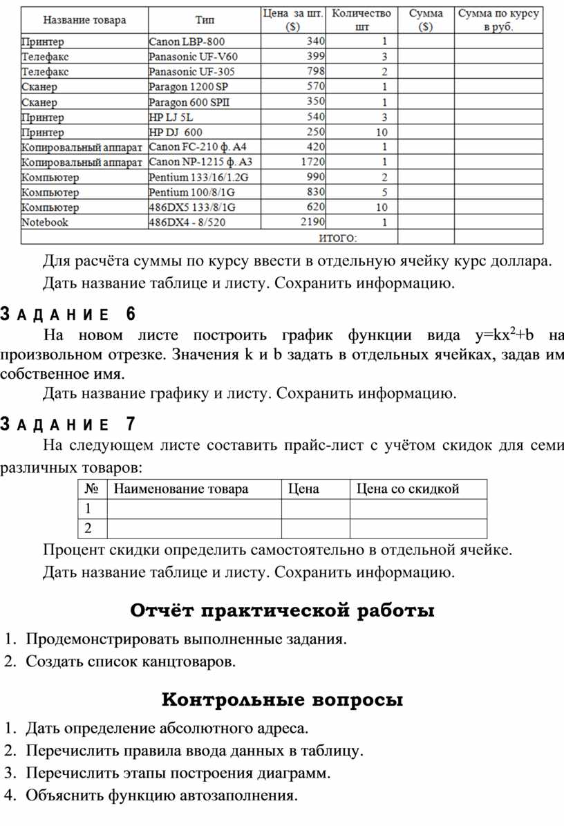 § Использовать относительные абсолютные адреса ячеек, при применении функции «Автозаполнение». § Отработать навык ввода формул для вычислений в таблицах; форматирования таблиц, переименования листов, оформления заголовков строк и столбцов таблиц. |