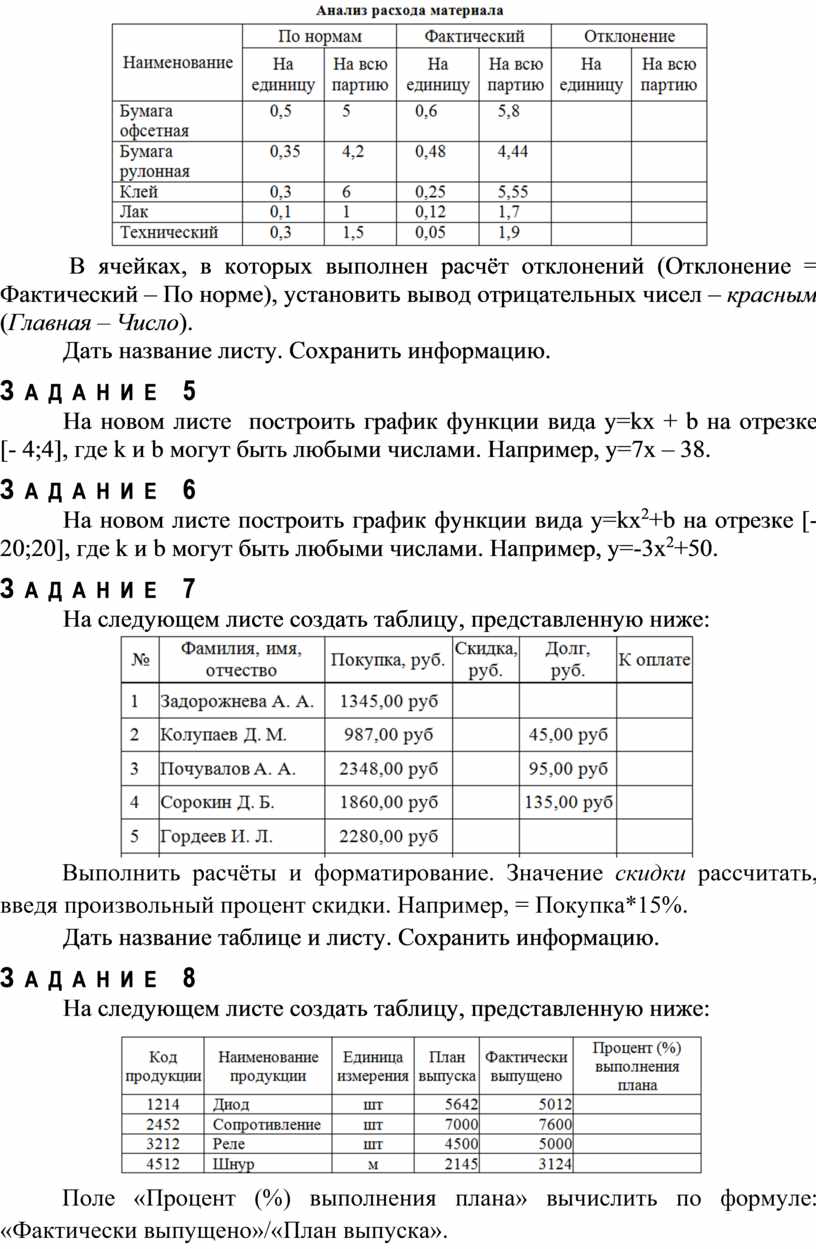 В ячейках, в которых выполнен расчёт отклонений (Отклонение = Фактический – По норме), установить вывод отрицательных чисел – красным (Главная – Число).