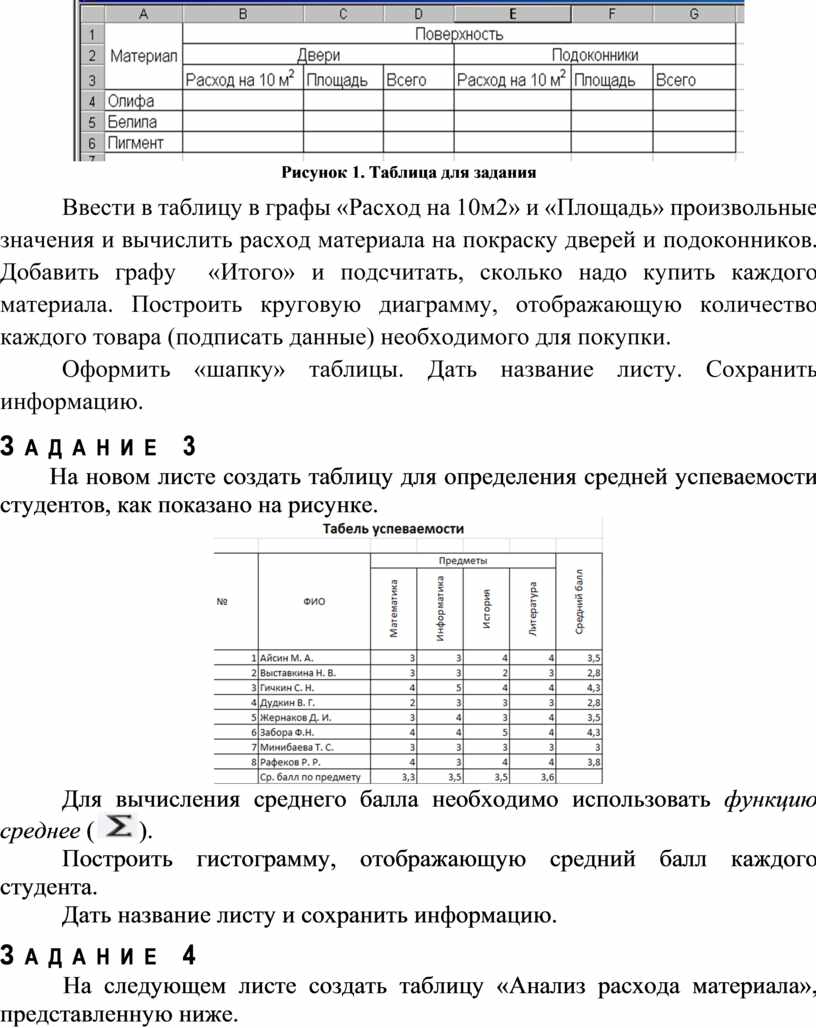 Ввести в таблицу в графы «Расход на 10м2» и «Площадь» произвольные значения и вычислить расход материала на покраску дверей и подоконников. Добавить графу «Итого» и подсчитать, сколько надо купить каждого материала. Построить круговую диаграмму, отображающую количество каждого товара (подписать данные) необходимого для покупки.