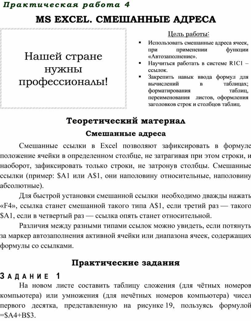 § Использовать смешанные адреса ячеек, при применении функции «Автозаполнение». § Научиться работать в системе R1C1 – ссылок. § Закрепить навык ввода формул для вычислений в таблицах; форматирования таблиц, переименования листов, оформления заголовков строк и столбцов таблиц. |