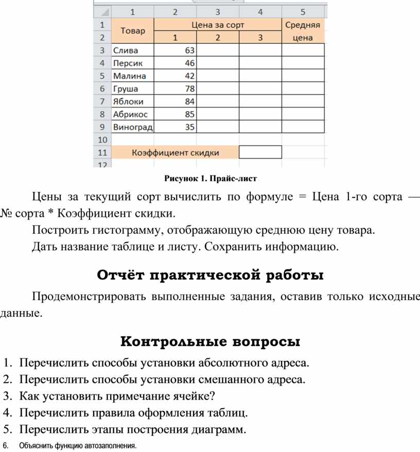 На следующем листе составить прайс-лист с учётом скидок для семи различных товаров: