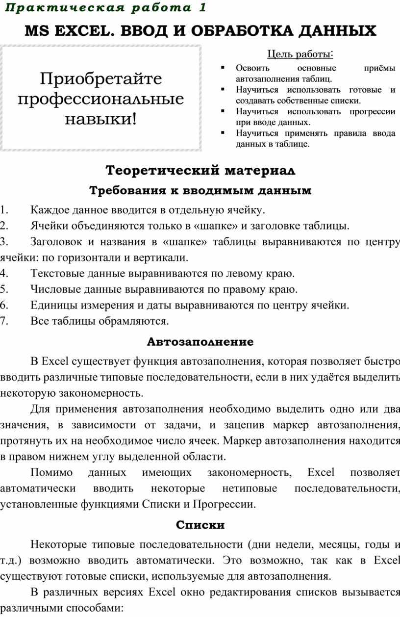 § Освоить основные приёмы автозаполнения таблиц. § Научиться использовать готовые и создавать собственные списки. § Научиться использовать прогрессии при вводе данных. § Научиться применять правила ввода данных в таблице. |