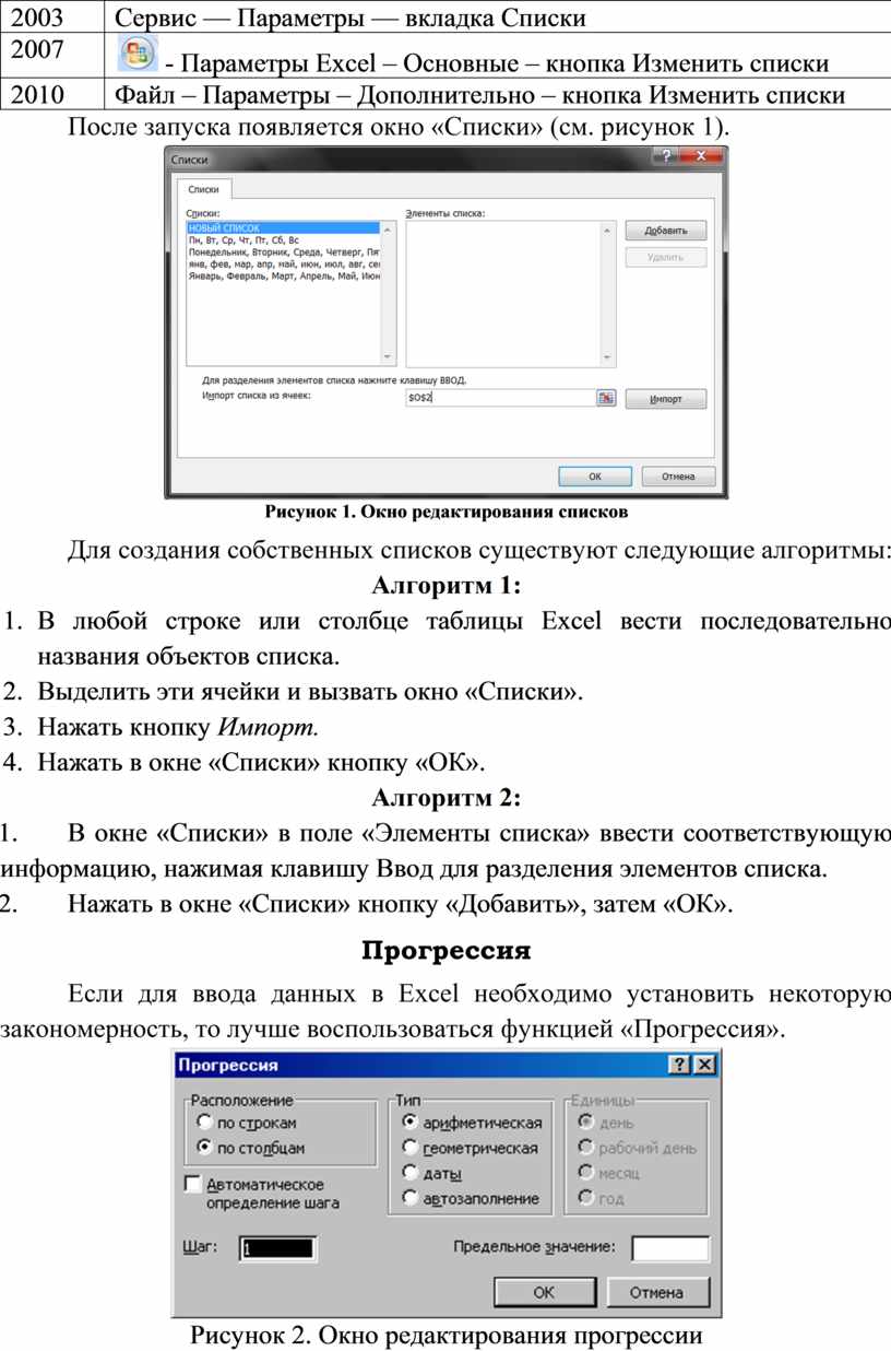 Помимо данных имеющих закономерность, Ехсеl позволяет автоматически вводить некоторые нетиповые последовательности, установленные функциями Списки и Прогрессии.