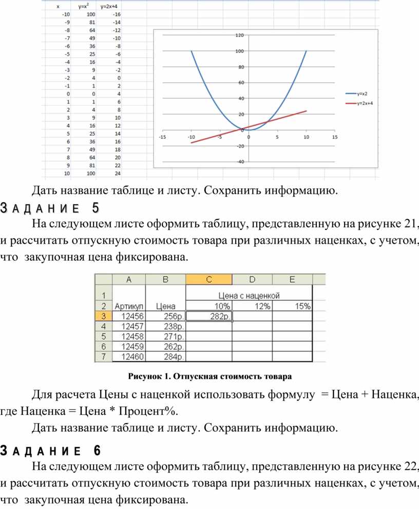 На новом листе построить график функции вида y=kx2+b на произвольном отрезке. Значения k и b задать в отдельных ячейках, задав им собственное имя.