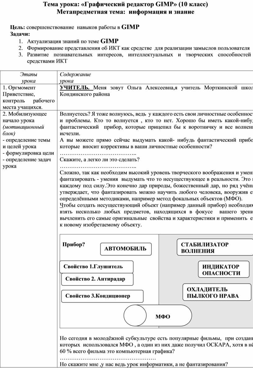 Но сегодня в молодёжной субкультуре есть популярные фильмы, при создании которых использовался МФО , а один из них даже получил ОСКАРА, хотя в нём 60 % всего фильма это компьютерная графика? …………………………………………… Но скажите мне ,у нас ведь урок информатики, а не фантазирования? Как информатика может быть связана с фантазированием (не менее 3-4 учащихся ) ………………… -Я согласна с вами, Компьютер- это средство, позволяющие воплотить все наши мысленные образы и фантазии в жизнь. Конечно можно создать изображение, используя любой графический редактор, например, какой вы изучаете в данный момент ……………………….. ТЕМА Растровый графический редактор «GIMP».