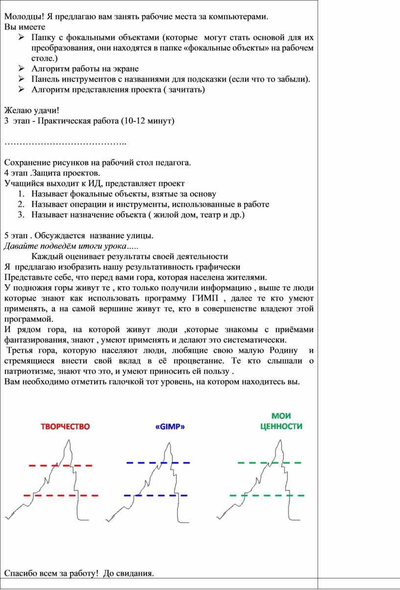 5 этап . Обсуждается название улицы. Давайте подведём итоги урока….. Каждый оценивает результаты своей деятельности Я предлагаю изобразить нашу результативность графически Представьте себе, что перед вами гора, которая населена жителями. У подножия горы живут те , кто только получили информацию , выше те люди которые знают как использовать программу ГИМП , далее те кто умеют применять, а на самой вершине живут те, кто в совершенстве владеют этой программой. И рядом гора, на которой живут люди ,которые знакомы с приёмами фантазирования, знают , умеют применять и делают это систематически. Третья гора, которую населяют люди, любящие свою малую Родину и стремящиеся внести свой вклад в её процветание. Те кто слышали о патриотизме, знают что это, и умеют приносить ей пользу . Вам необходимо отметить галочкой тот уровень, на котором находитесь вы.