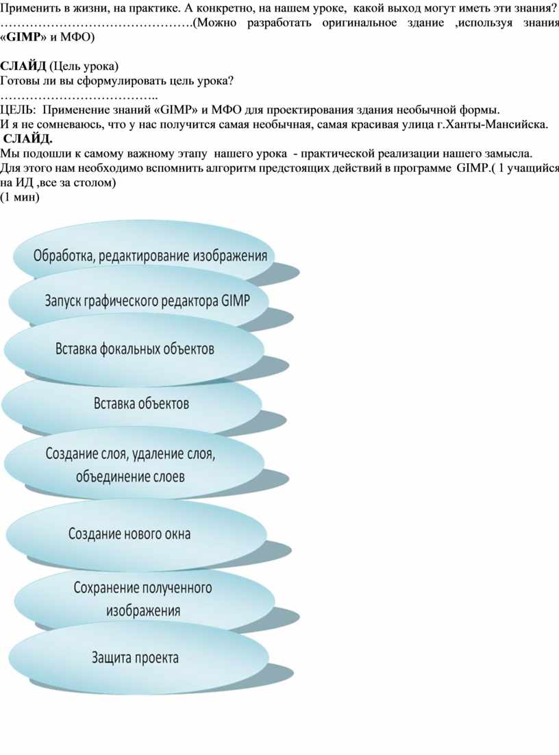 СЛАЙД (Цель урока) Готовы ли вы сформулировать цель урока? ……………………………….. ЦЕЛЬ: Применение знаний «GIMP» и МФО для проектирования здания необычной формы. И я не сомневаюсь, что у нас получится самая необычная, самая красивая улица г.Ханты-Мансийска. СЛАЙД. Мы подошли к самому важному этапу нашего урока - практической реализации нашего замысла. Для этого нам необходимо вспомнить алгоритм предстоящих действий в программе GIMP.( 1 учащийся на ИД ,все за столом) (1 мин)