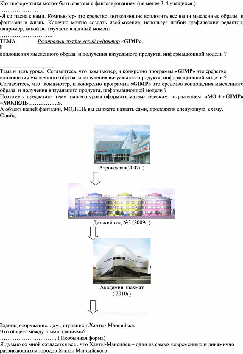 Здание, сооружение, дом , строение г.Ханты- Мансийска. Что общего между этими зданиями? …………………………. ( Необычная форма) Я думаю со мной согласятся все , что Ханты-Мансийск – один из самых современных и динамично развивающихся городов Ханты-Мансийского автономного округа, который радует своими красивыми и неординарными сооружениями. И наверное вам будет приятно внести свой вклад в процветание своей малой Родины, поскольку вы все наверное являетесь патриотами своего города . Давайте дополним тему урока. «МО + «GIMP» =МОДЕЛЬ ЗДАНИЯ НЕОБЫЧНОЙ ФОРМЫ». Предлагаю вам пофантазировать ,используя популярный среди изобретателей приём , который называется метод фокальных объектов. Итак, чтобы создать несуществующий объект необходимо взять несколько любых предметов, находящихся в поле вашего зрения, вычленить его самые оригинальные свойства и характеристики и объединить их в одном объекте. Например, я возьму ………… Слайд