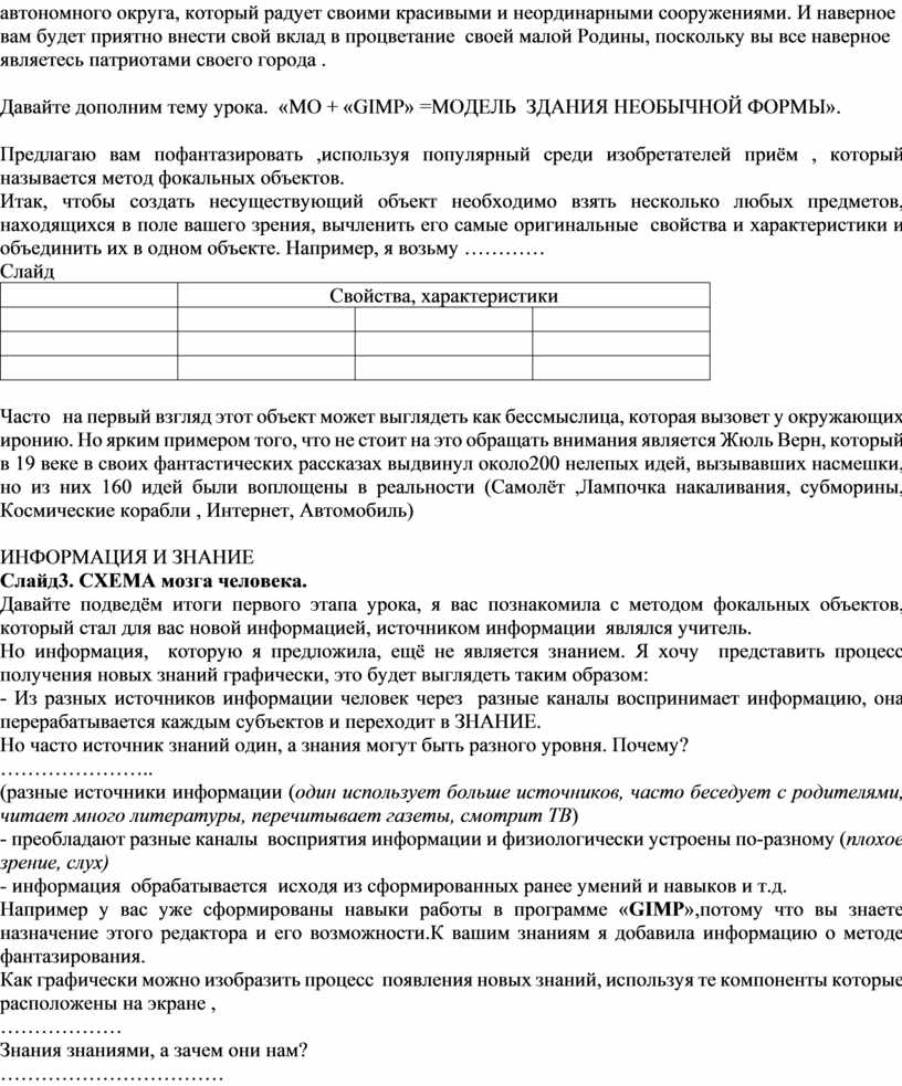 ИНФОРМАЦИЯ И ЗНАНИЕ Слайд3. СХЕМА мозга человека. Давайте подведём итоги первого этапа урока, я вас познакомила с методом фокальных объектов, который стал для вас новой информацией, источником информации являлся учитель. Но информация, которую я предложила, ещё не является знанием. Я хочу представить процесс получения новых знаний графически, это будет выглядеть таким образом: - Из разных источников информации человек через разные каналы воспринимает информацию, она перерабатывается каждым субъектов и переходит в ЗНАНИЕ. Но часто источник знаний один, а знания могут быть разного уровня. Почему? ………………….. (разные источники информации (один использует больше источников, часто беседует с родителями, читает много литературы, перечитывает газеты, смотрит ТВ) - преобладают разные каналы восприятия информации и физиологически устроены по-разному (плохое зрение, слух) - информация обрабатывается исходя из сформированных ранее умений и навыков и т.д. Например у вас уже сформированы навыки работы в программе «GIMP»,потому что вы знаете назначение этого редактора и его возможности.К вашим знаниям я добавила информацию о методе фантазирования. Как графически можно изобразить процесс появления новых знаний, используя те компоненты которые расположены на экране , ……………… Знания знаниями, а зачем они нам? …………………………… Применить в жизни, на практике. А конкретно, на нашем уроке, какой выход могут иметь эти знания? ……………………………………….(Можно разработать оригинальное здание ,используя знания «GIMP» и МФО)