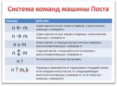 Назначение машины Поста - производить преобразования на информационной ленте. Исходное состояние ленты можно рассматривать как исходные данные задачи, конечное состояние ленты - результат решения задачи. Кроме того, в исходные данные входит информация о начальном положении каретки. Рассмотрим систему команд машины Поста
