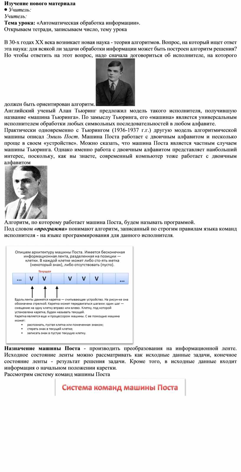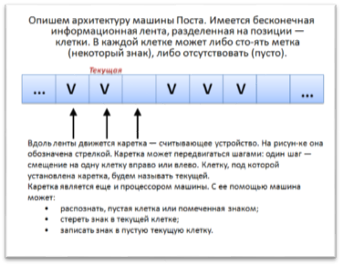 алгоритм. Английский ученый Алан Тьюринг предложил модель такого исполнителя, получившую название «машина Тьюринга». По замыслу Тьюринга, его «машина» является универсальным исполнителем обработки любых символьных последовательностей в любом алфавите. Практически одновременно с Тьюрингом (1936-1937 г.г.) другую модель алгоритмической машины описал Эмиль Пост. Машина Поста работает с двоичным алфавитом и несколько проще в своем «устройстве». Можно сказать, что машина Поста является частным случаем машины Тьюринга. Однако именно работа с двоичным алфавитом представляет наибольший интерес, поскольку, как вы знаете, современный компьютер тоже работает с двоичным алфавитом