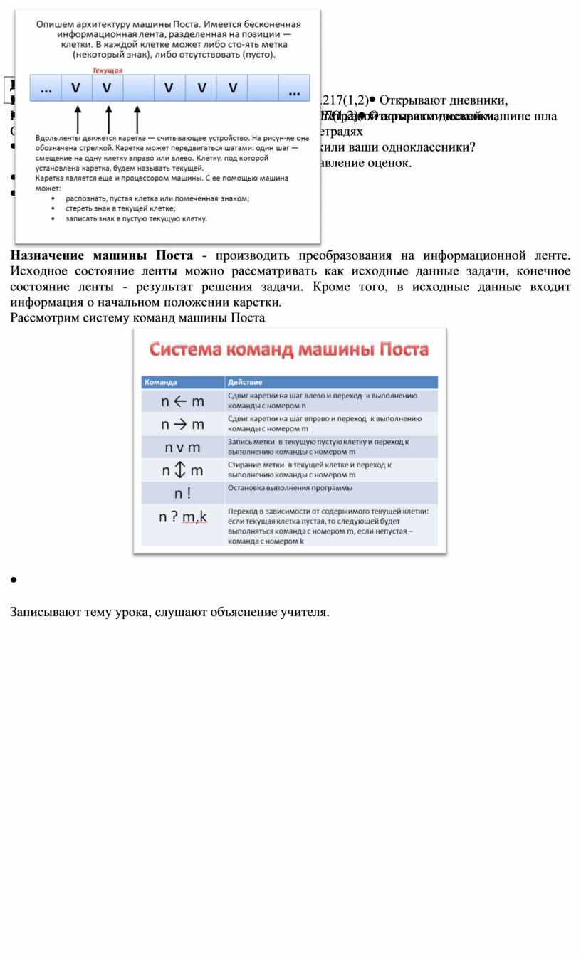 Планируемые результаты: знать устройство и систему команд алгоритмической машины Поста; уметь составлять алгоритмы решения несложных задач для управления машиной Поста