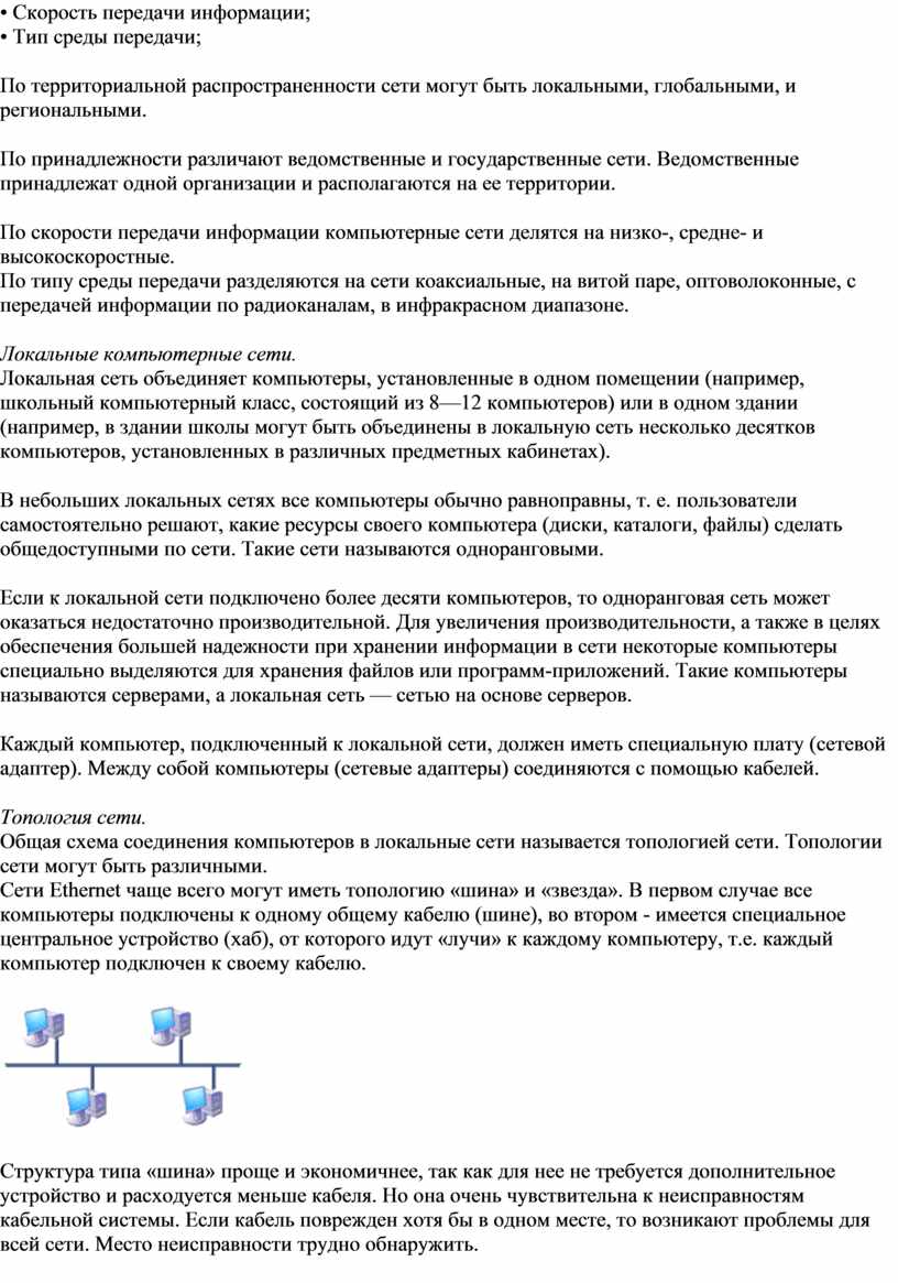 Общая схема соединения компьютеров в локальные сети называется топологией сети.