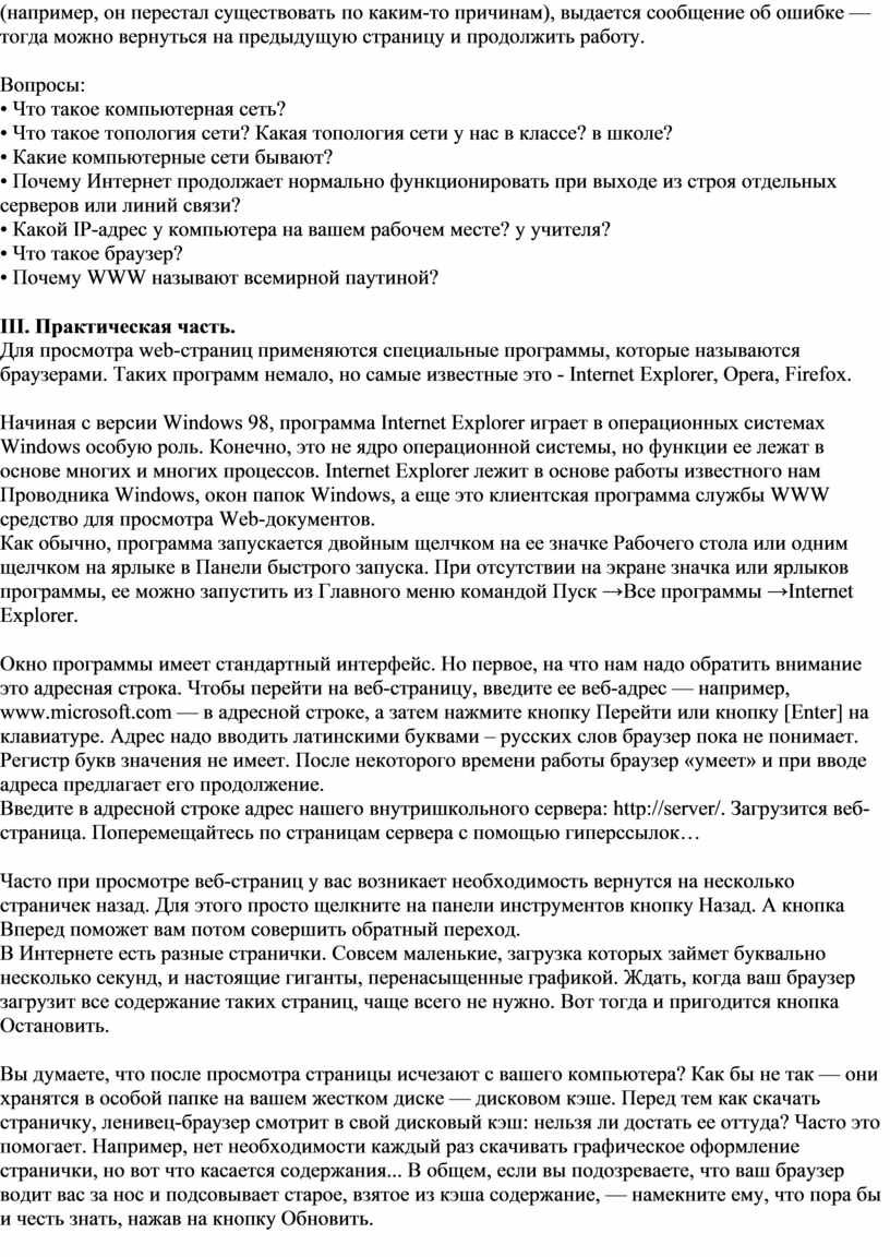 С каждой гиперссылкой в Сети связан Web-адрес некоторого документа или объекта (файла с рисунком, звукозаписью, видеоклипом и т. п.). При щелчке на гиперссылке в Сеть отправляется запрос на поставку того объекта, на который указывает гиперссылка. Если такой объект существует по указанному адресу, он загружается и воспроизводится. Если его нет в природе (например, он перестал существовать по каким-то причинам), выдается сообщение об ошибке — тогда можно вернуться на предыдущую страницу и продолжить работу.