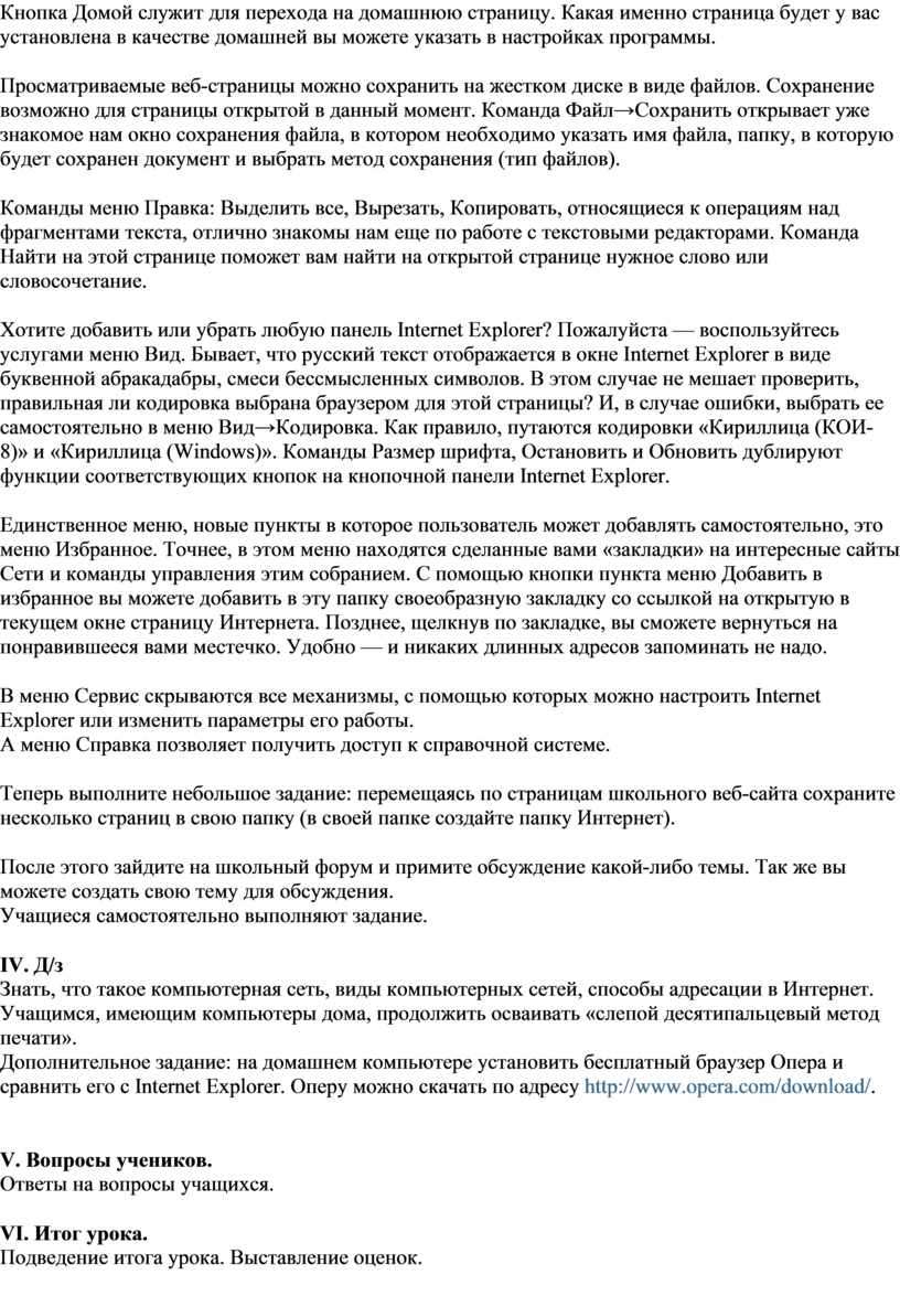 Теперь выполните небольшое задание: перемещаясь по страницам школьного веб-сайта сохраните несколько страниц в свою папку (в своей папке создайте папку Интернет).
