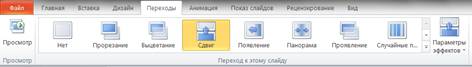 Для установки анимации к слайду необходимо на вкладке Анимация установить Переход к этому слайду (в Microsoft Office 2010 на вкладке Переходы).
