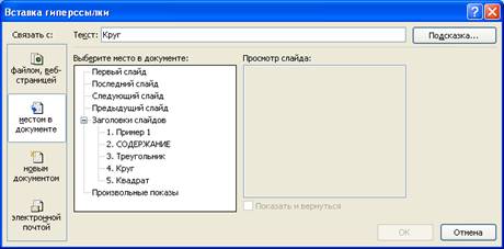 § в появившемся окне выбрать параметр связи «Местом в документе» и указать слайд, на который необходимо осуществить переход в окне «Выберите место в документе».