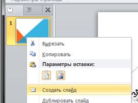 1. В контекстном меню первого слайда из Списка слайдов, выбрать Создать слайд.