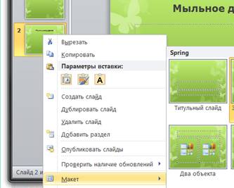 2. На втором слайде в контекстном меню выбрать по команде Макет интересующий вариант.